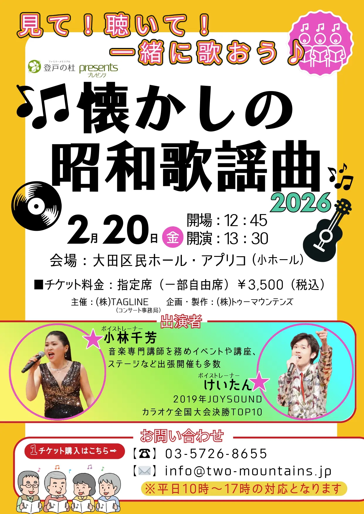 来たる2月20日㈮、太田区民ホール・アプリコ(小ホール)にて「見て!聴いて!一緒に歌おう♪懐かしの昭和歌謡曲2026」を開催します!